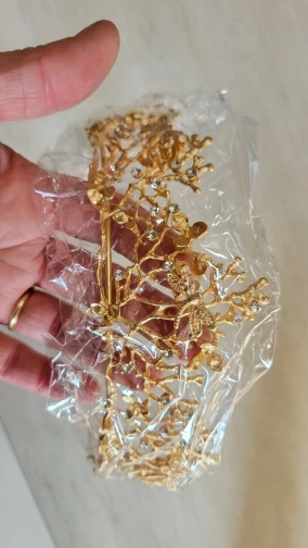 Как на фото. Золото с стрекозами. Материал слегка хрупкий, хотя он был упакован с осторожностью верхняя часть была слегка согнута, когда он прибыл и там, где трещины в покрытии вокруг этого пятна. Поэтому я бы посоветовал носить и хранить его с осторожностью.