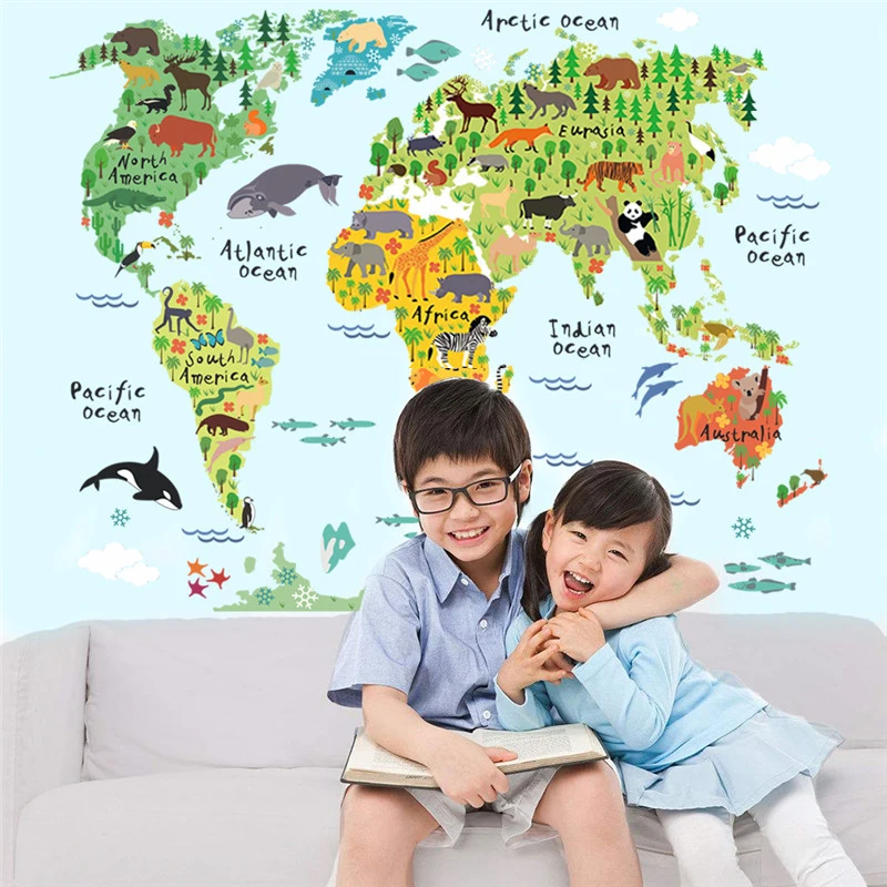Мультяшные животные карта мира наклейки на стену для детской комнат...