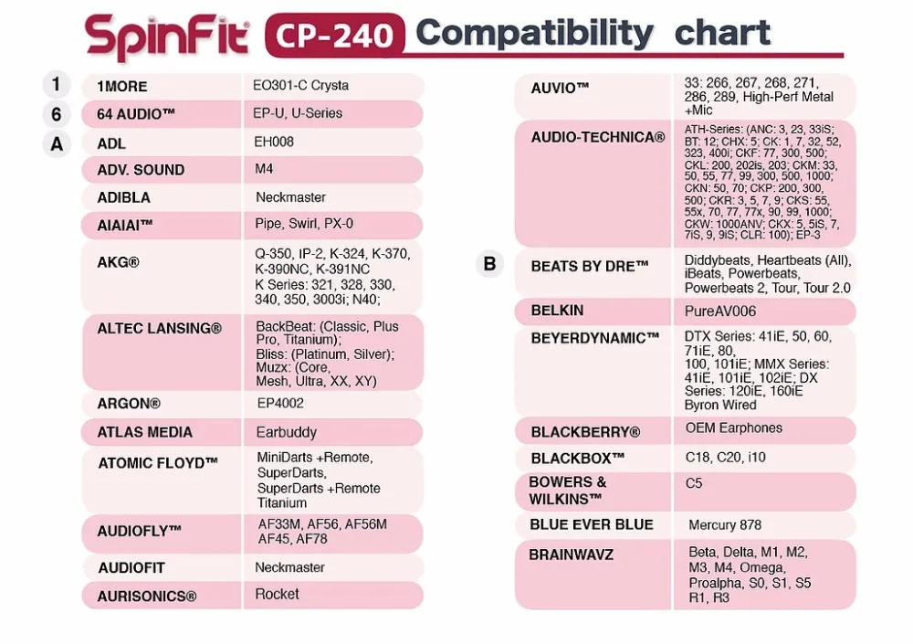 Уникальная звуковая трубка SpinFit крепится к конструкции подушки. Эта конфигурация позволяет ухо может вращаться на 360 °, этот дизайн был многонациональным патентом. Страна приобретения патента: США, ЕС, Япония, Тайвань, материковый Китай
