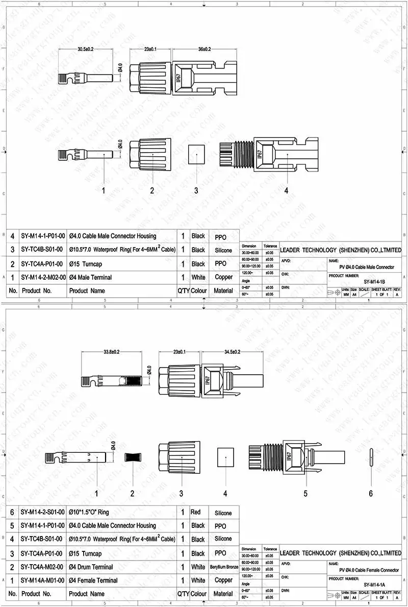 Степень защитыIP67Степень загрязнения окружающей среды2Класс защиты от поражения электрическим токомКласс IIПламя классаUL94-V0Штепсельной вилки силыМеньше, чем 50NУдерживающей силойБольше, чем 50NДиапазон температуры окружающей среды-40 ~ + 90.Совместимый кабель поперечных сечений Солнечный Кабель2,5 мм ⊃ 2; , 4,0 мм ⊃ 2; И 6,0 мм ⊃ 2; (14 awg,12awg,10awg)Pin размер4,0 мм