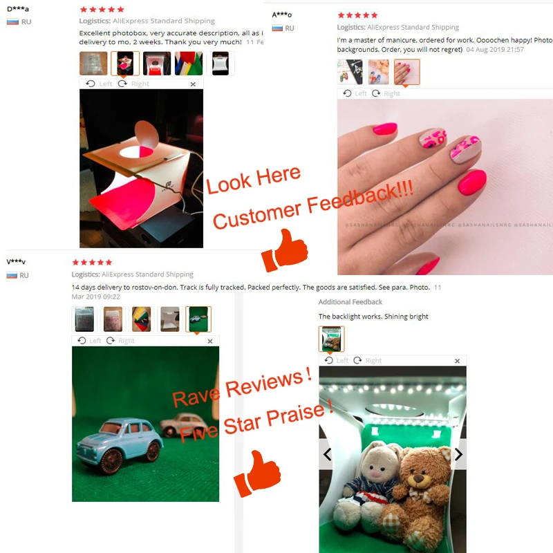 Отличная коробочка для съёмки предметки. Фотки получаются бомба. Заказывал с двумя светодиодными лентами. До Тольятти заказ пришёл за несколько дней.