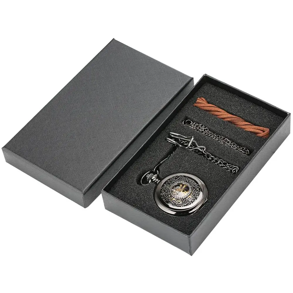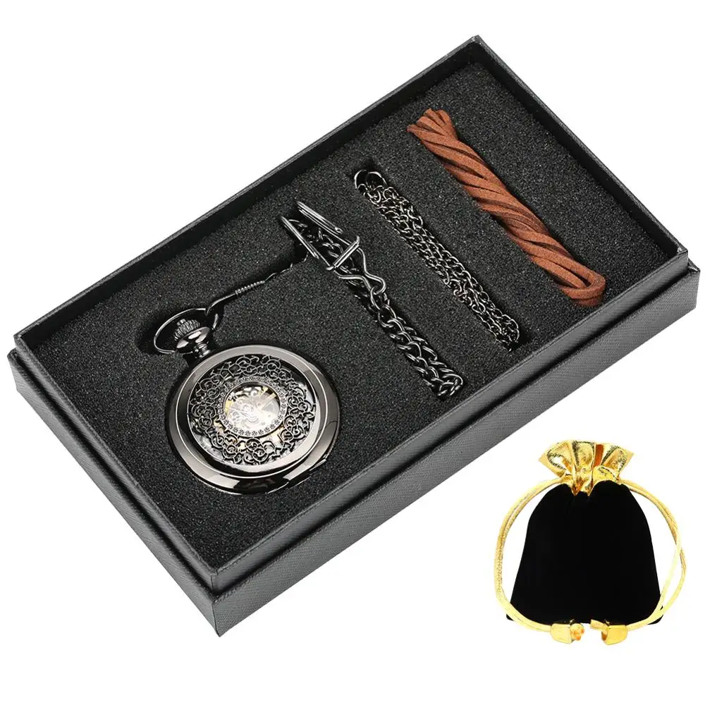 Винтажные роскошные черные металлические механические карманные часы, гладкие стимпанк часы с ручным заводом, набор с подарочной коробкой, кожаной цепочкой
