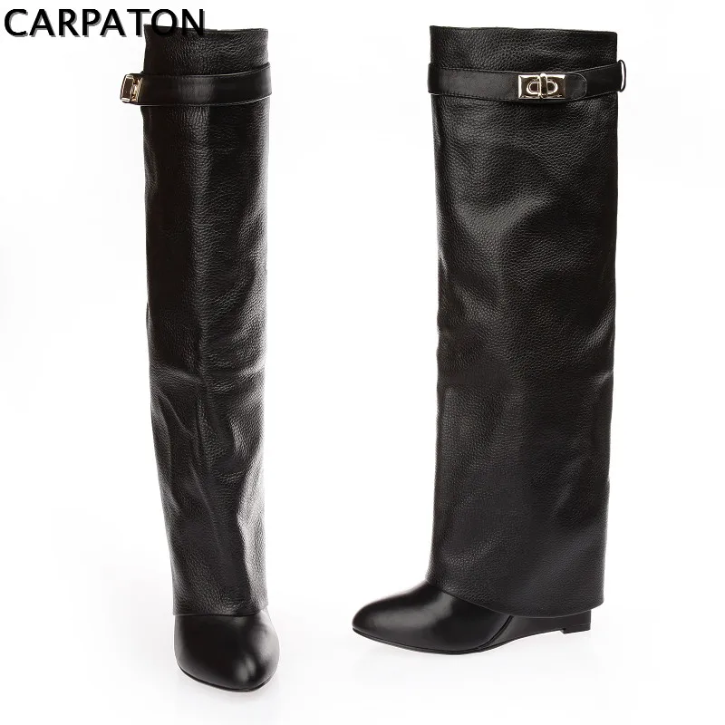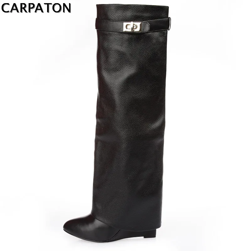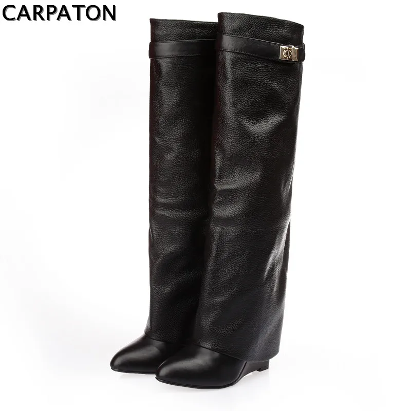 Женские высокие сапоги до колена Carpaton, черные кожаные сапоги с острым носком, увеличивающие рост, с замком акулы, для верховой езды, 2019