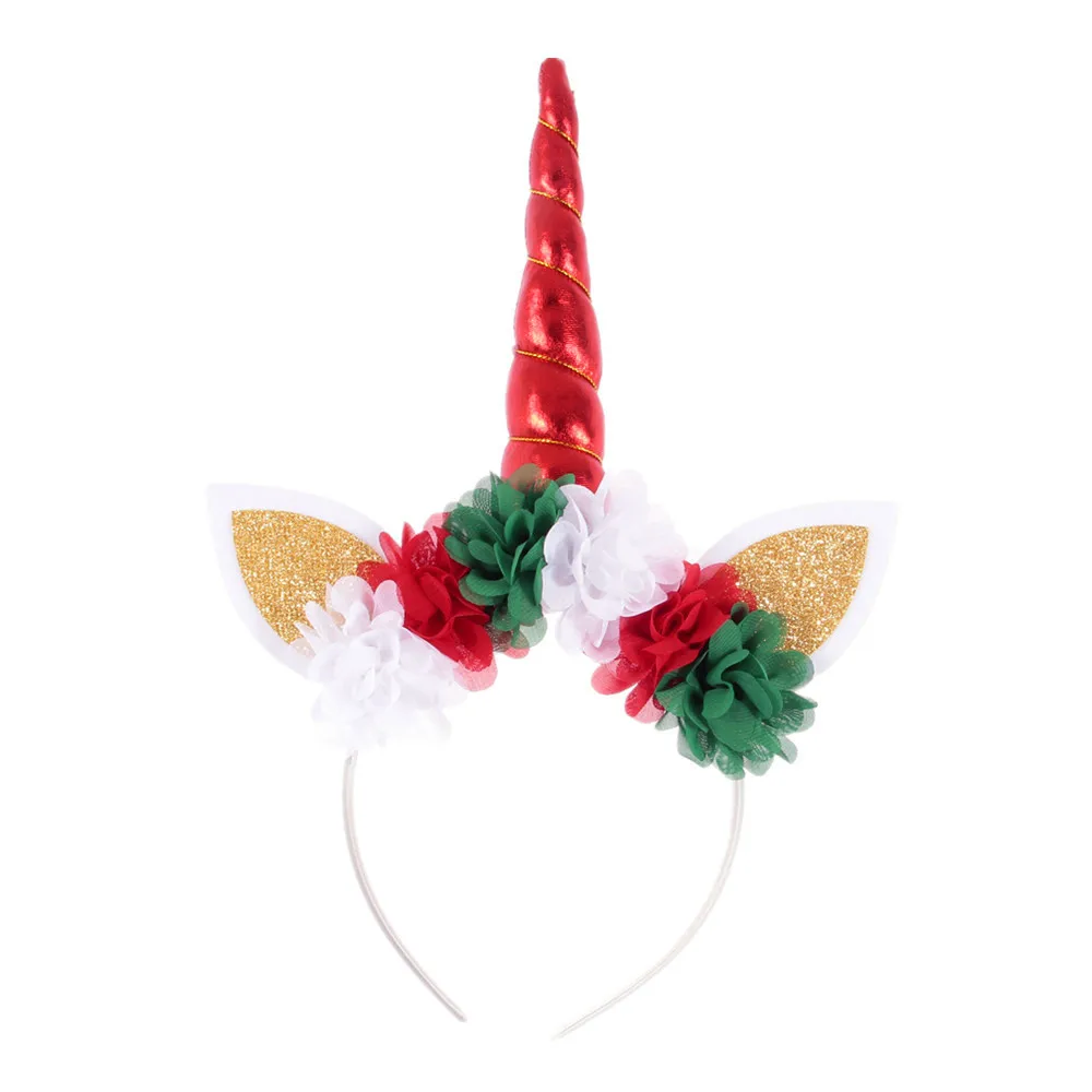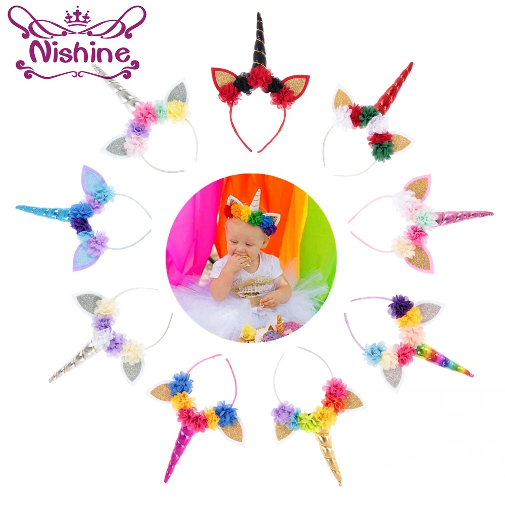 Детские вечерние ободки ручной работы Nishine, золотистыеСеребристые ободки в виде рога единорога, повязка на голову с цветами для девочек, аксессуары для волос на день рождения