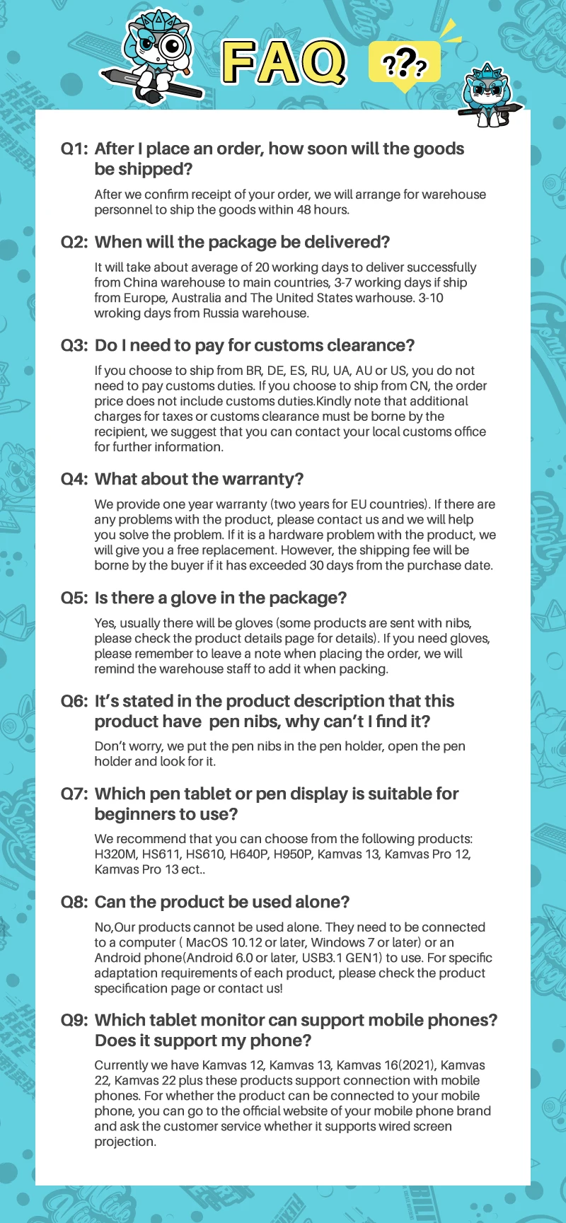 Товар пришёл довольно быстро(до Тюменской области меньше чем за месяц), драйвера устанавливаются легко, стилус и горячие клавиши настраиваются. Для новичка в плане рисования сойдёт! Расстроило то, что у меня и родителей андроид 9, для данного графического планшета OТG функция поддерживается только на андроиде 6. А так товар отлично подойдёт для начинающего художника в диджитал артах. Рекомендую!