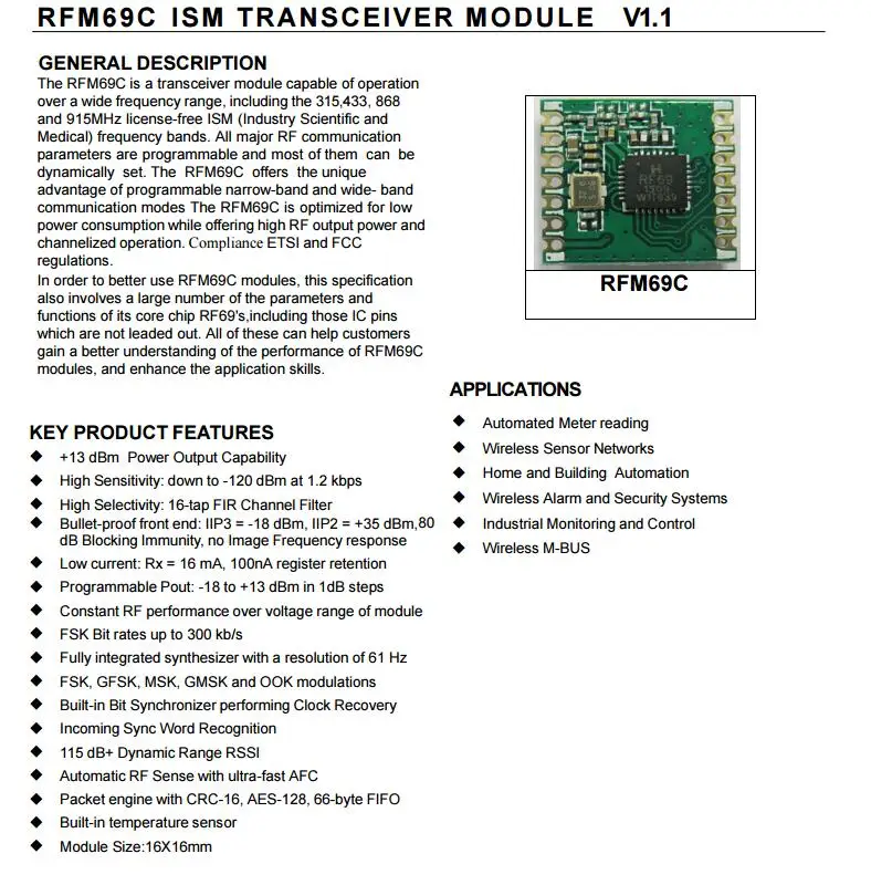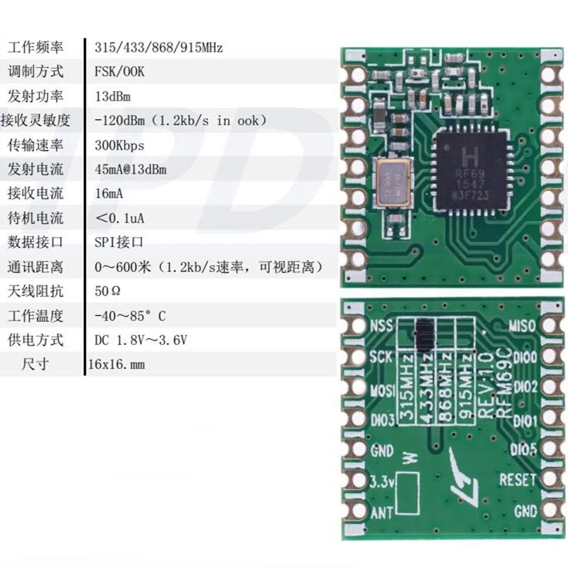 RFM69C RFM69CW FSK беспроводной модуль трансивера SX1231 13 дБ 433 МГц 868 МГц 915 МГц SPI 16*16 мм