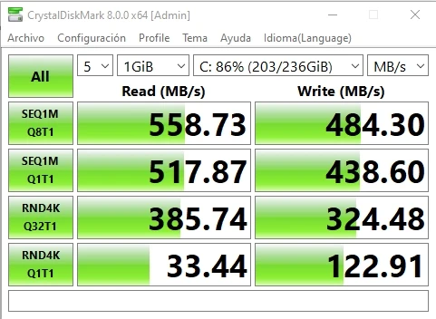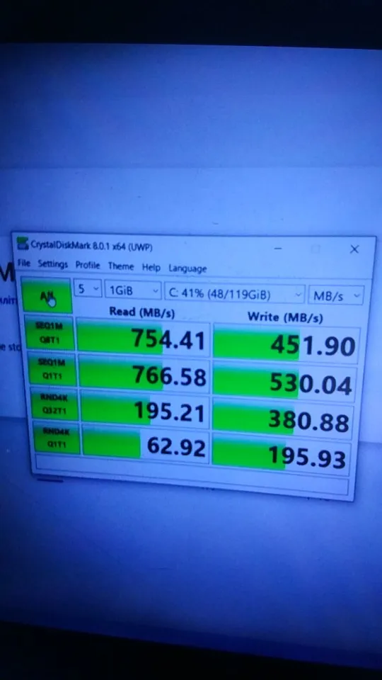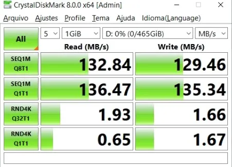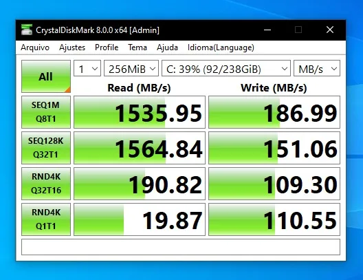 Я протестировал его с интерфейсом 2,0 и адаптером, диск C-это SSD, а другой-NVME, чтобы увидеть справочные значения со старым интерфейсом, Я знаю, что не могу выжать весь ваш потенциал, но если он будет быстрее, чем SSD adata 630