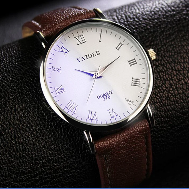 Часы YAZOLE Мужские кварцевые, с синим стеклом, с кожаным ремешком