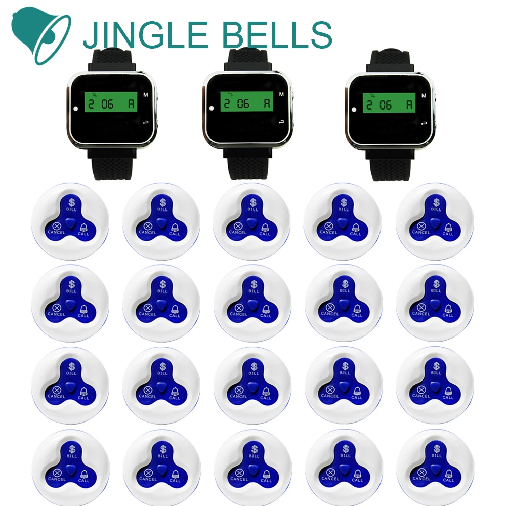 Беспроводная система вызова JINGLE BELLS, 20 кнопок + 3 часы-пейджер, приемник для номера ресторана, для гостей официанта