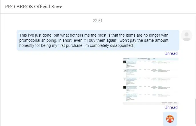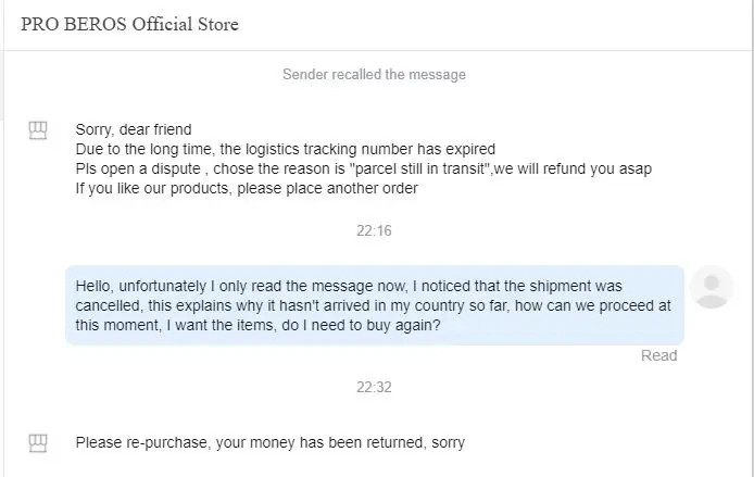 Магазин только не отправил товары: "LE271287126SE, 10/06 03:28 Отправитель напоминает сообщение Извините, дорогой друг Из-за долгого времени, номер отслеживания логистики истек Пожалуйста, откройте спор, выберите причину «посылка все еще находится в пути», мы вернем вам деньги как можно скорее Если вам нравится наша продукция, Пожалуйста, разместите другой заказ" Что было сделано, однако товары уже были с различными ценностями или ценностями поставок, подытоживая несколько дней, получив продукты, не рекомендую «Официальный магазин pro Beros». Потеряв свое время, теперь придется ждать больше дней, чтобы получить стоимость, возвращенную через PayPal. Обязательства клиентов, ноль!