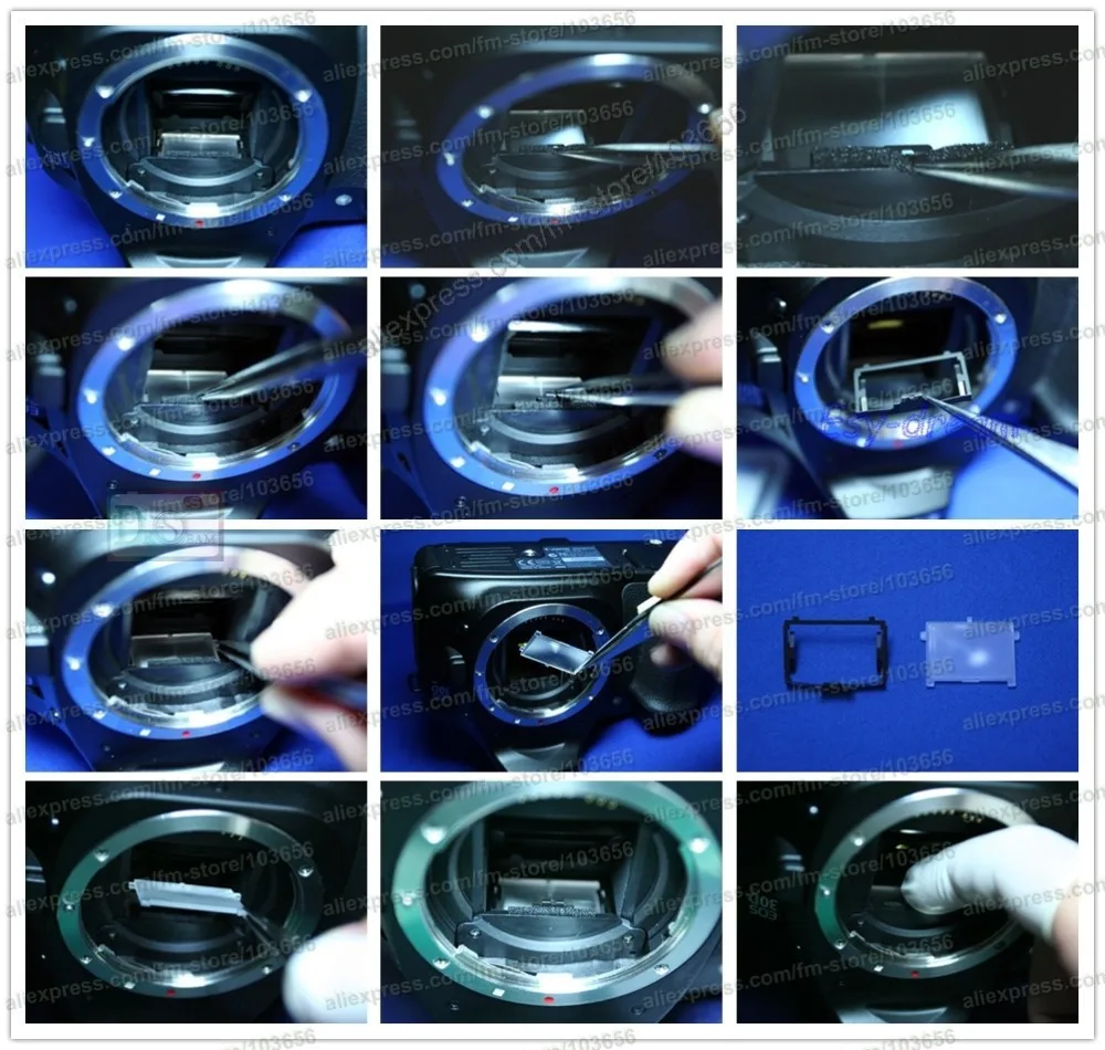 Пожалуйста, обратите внимание: никогда не прикасайтесь к экрану пальцами или не держите экран в руке, если экран будет размазанным отпечатком пальца или инородным веществом, пятно будет очень трудно удалить. Также будьте осторожны, чтобы не размазывать зеркало или другие части камеры при смене фокусирующего экрана.