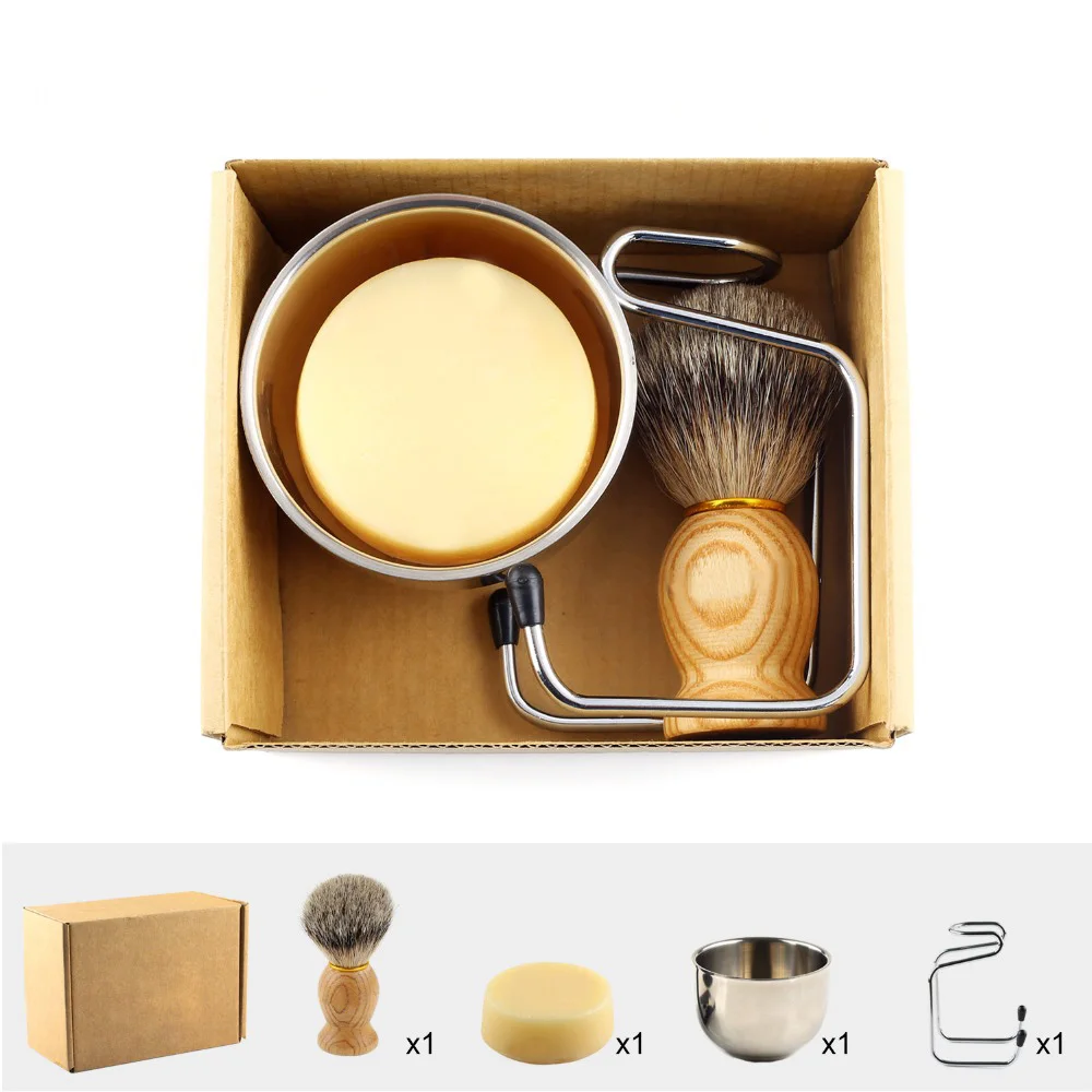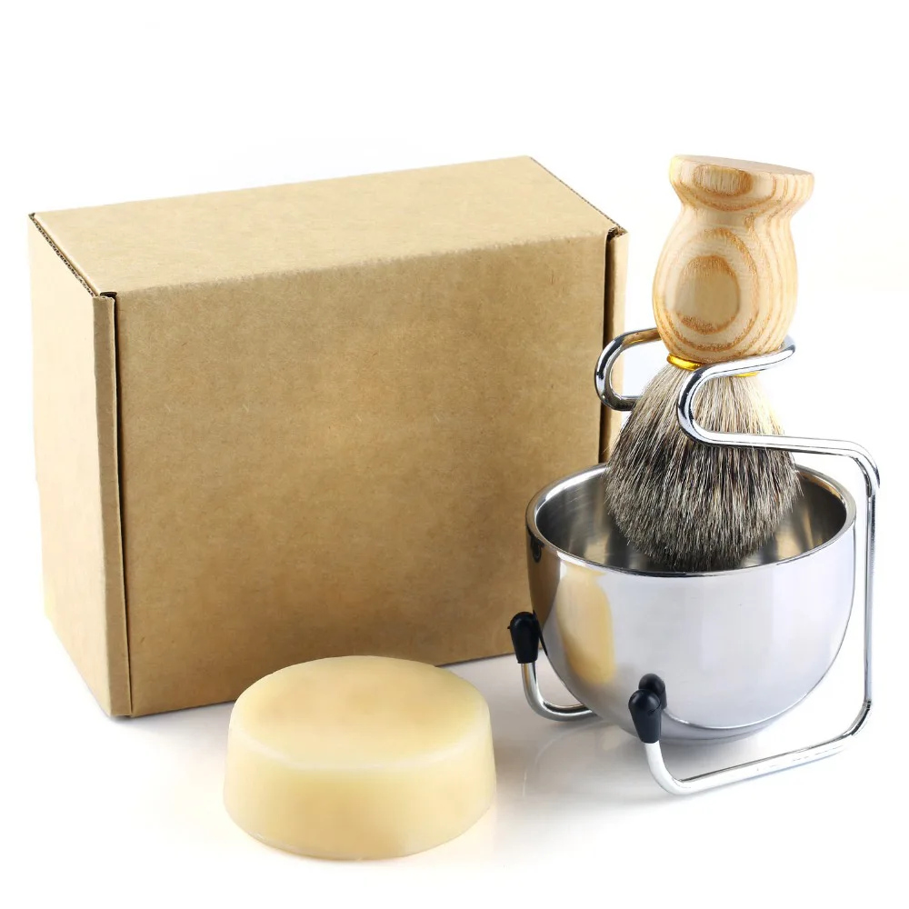 Набор помазков для бритья, 4 предмета в комплекте из чистой барсучьей шерсти кисть из массива дерева дверные ручки с Козье Молоко Мыло для бритья 100g, Нержавеющая сталь стенд для бритья и 2 слоя Чаша для бритья комплект идеально подходит для Для мужчин подарок