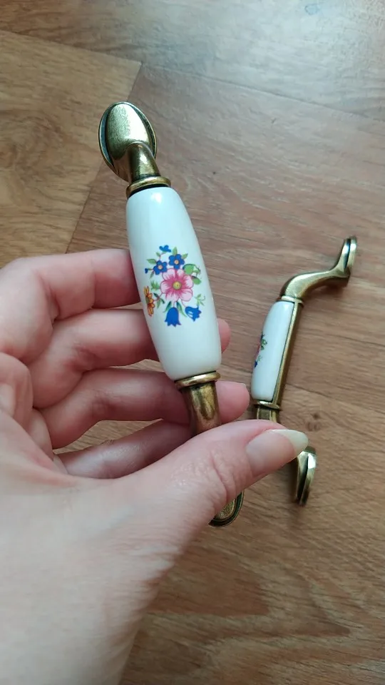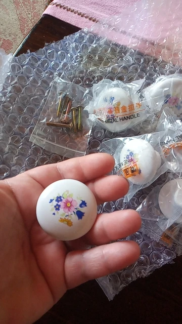 Really beautiful handles. Real ceramic and metal. Nicely shaped, ends are smooth and generally well done. The drawings are vivid and sharp, no blurness. They are strong, firm and fit well to any furniture. It arrived it 24 days, finally some improvement.