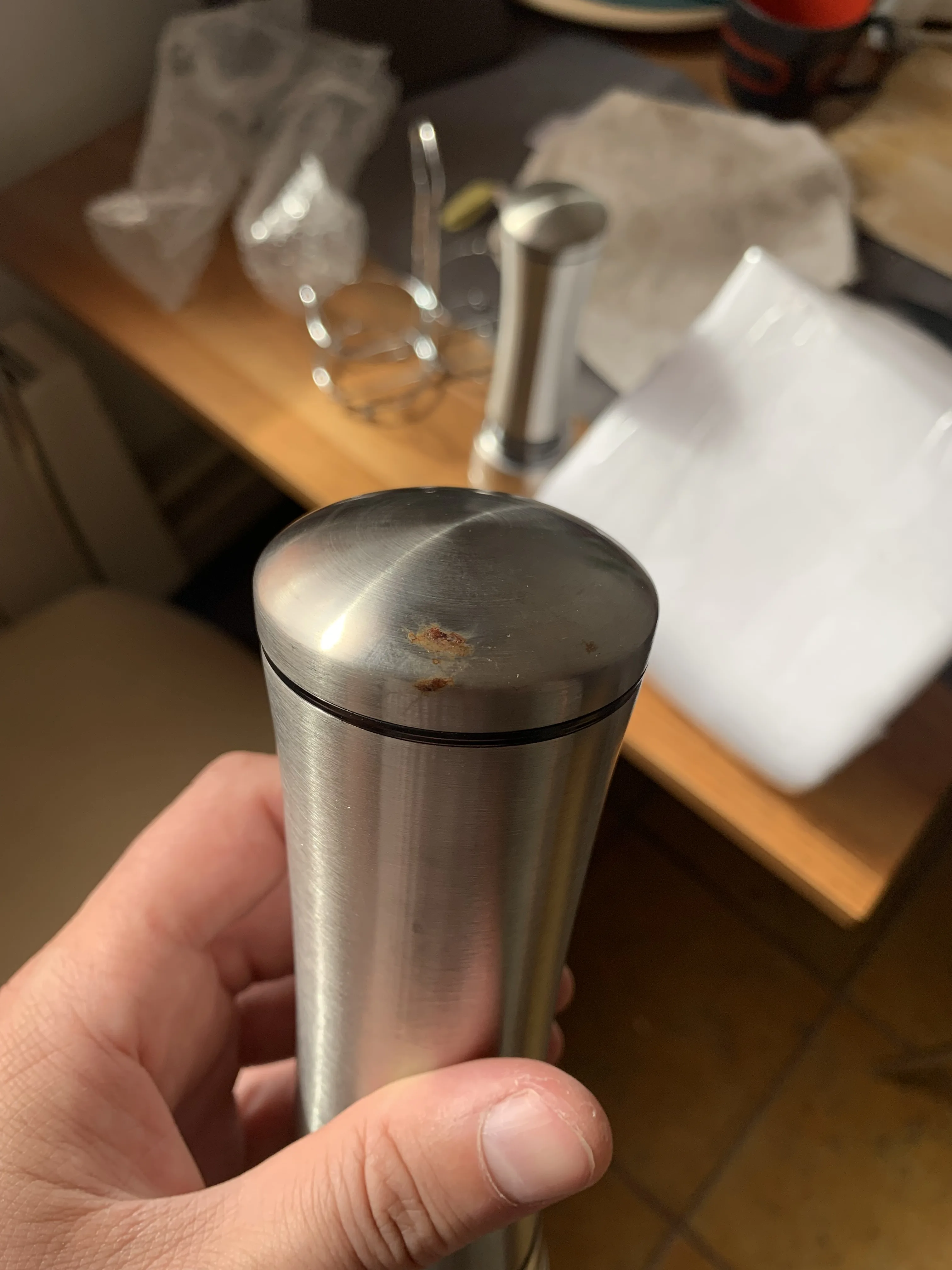 Мельница просто огромная. Крышка чуть замятая, что не критично.
