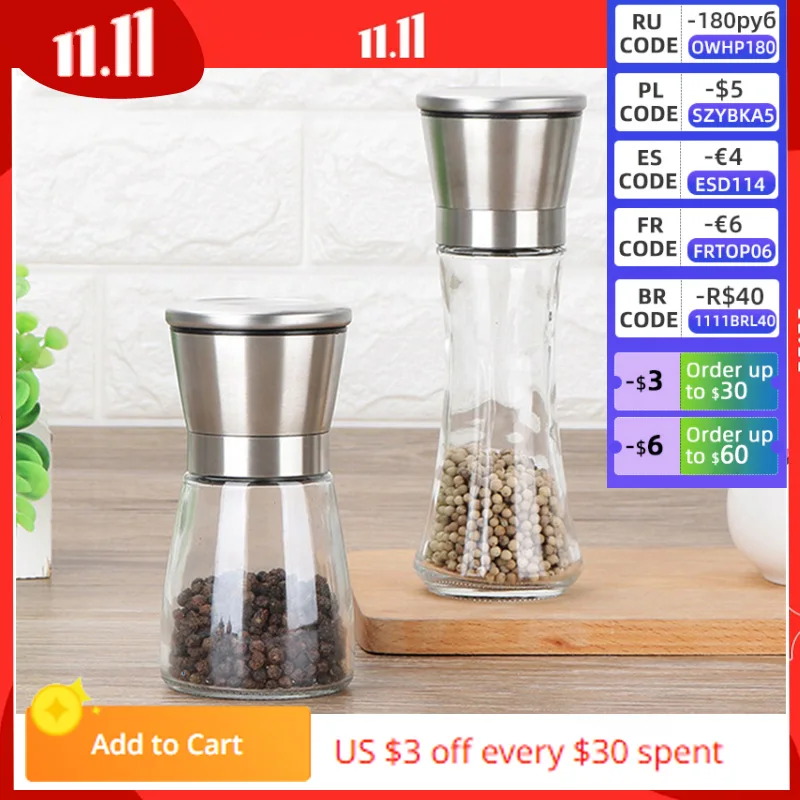Мельница для специй со стеклянным корпусом, 1 шт., модная мельница из нержавеющей стали для соли и перца, кухонные аксессуары, портативный инструмент для приготовления пищи