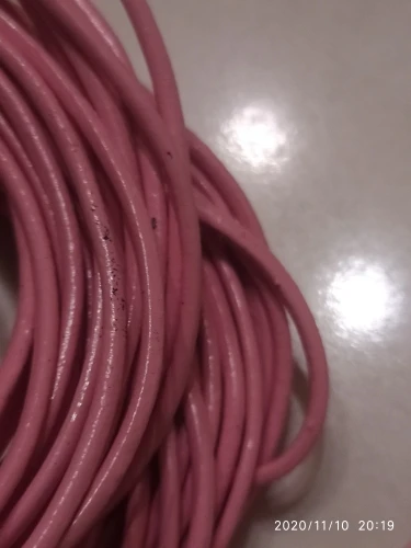 Доставка 17 дней. Отслеживалось.Шнурок из натуральной кожи, метраж не перемеряла, но моток большой. Присутствует только запах кожи,других запахов нет.Местами шнур прокрашен неравномерно.Цвет розового шнура, в описании продавца, передан довольно точно, моя камера немного исказила оттенок.В целом, покупкой осталась довольна.