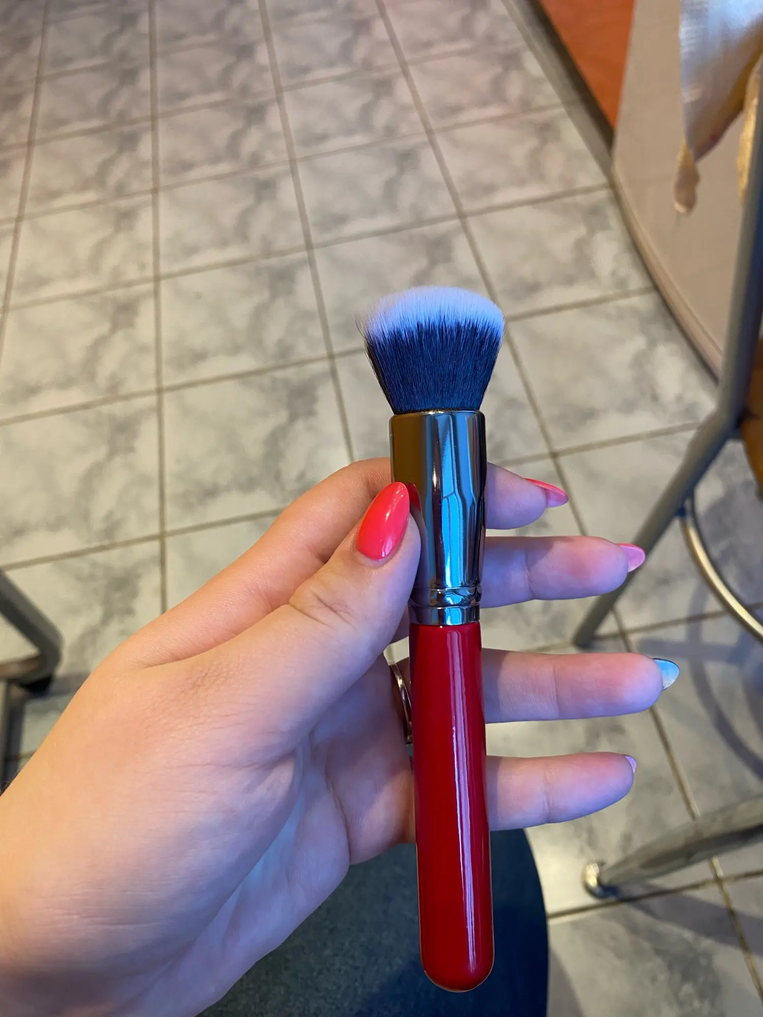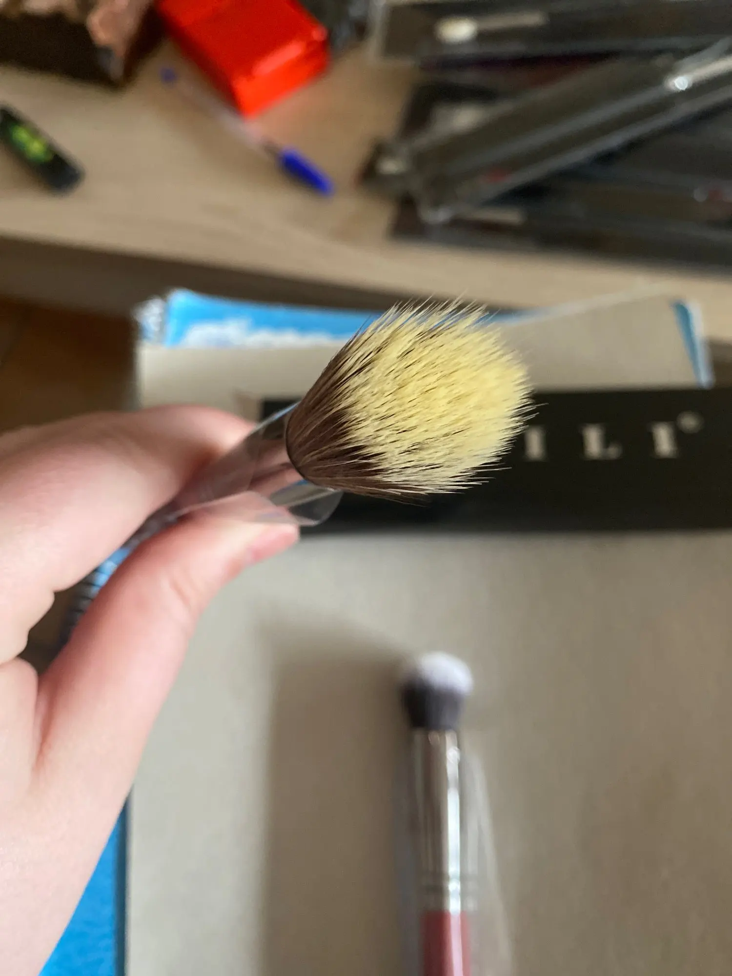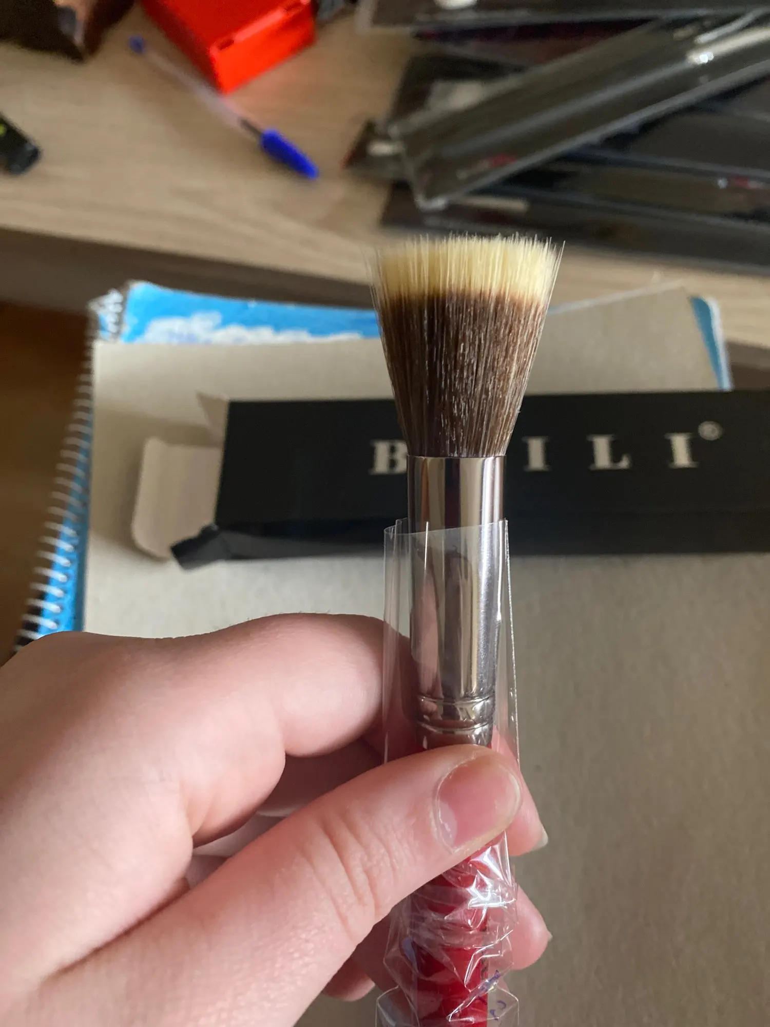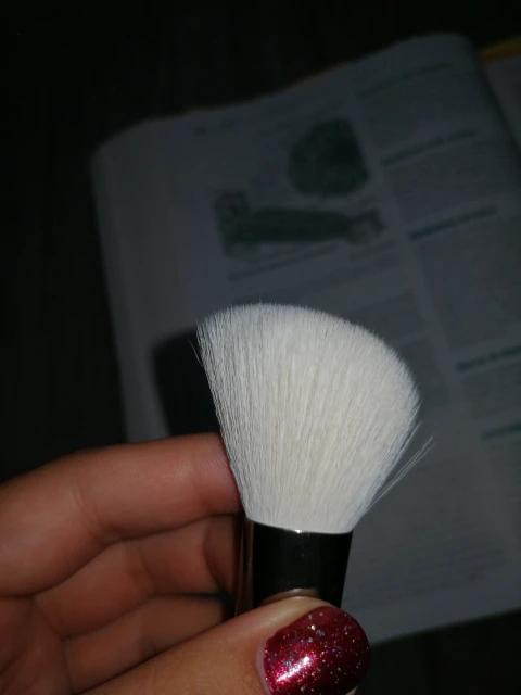 Кисть для румян. Нормальное качество. Ворс очень мягкий. Длина ворса 3 см (с длинной стороны). Длина ручки 14 см.