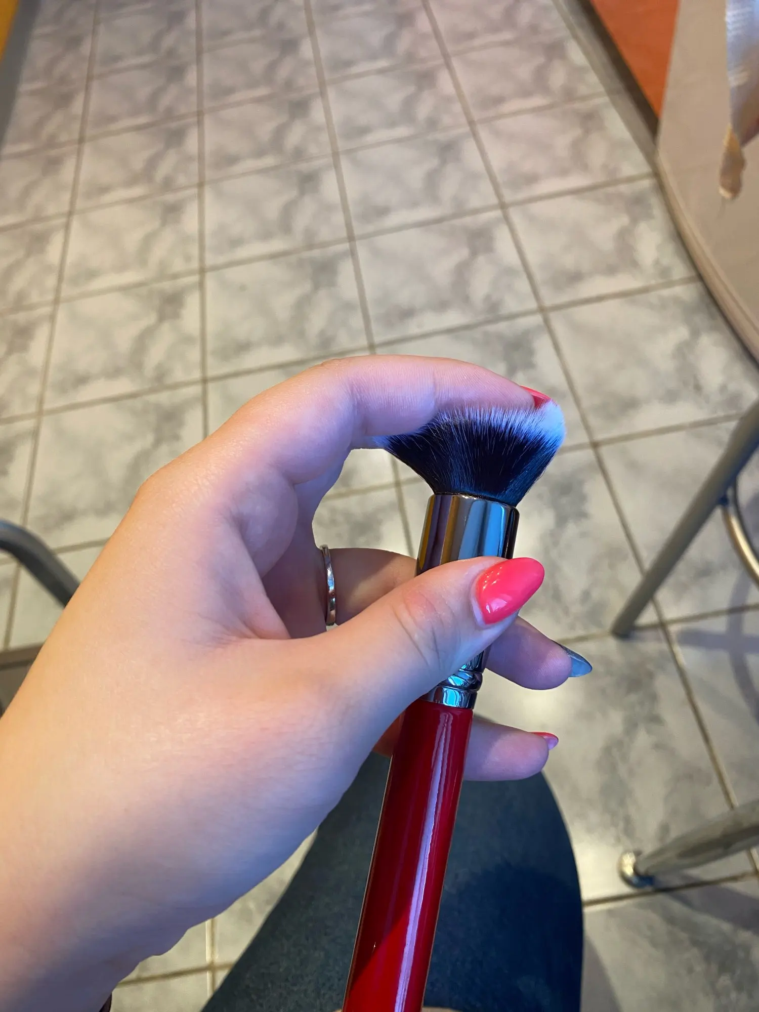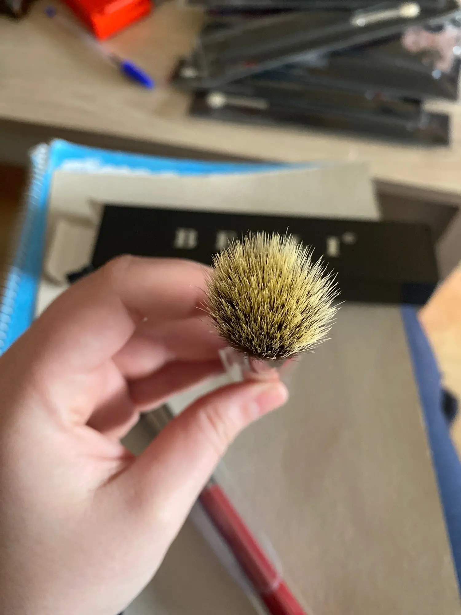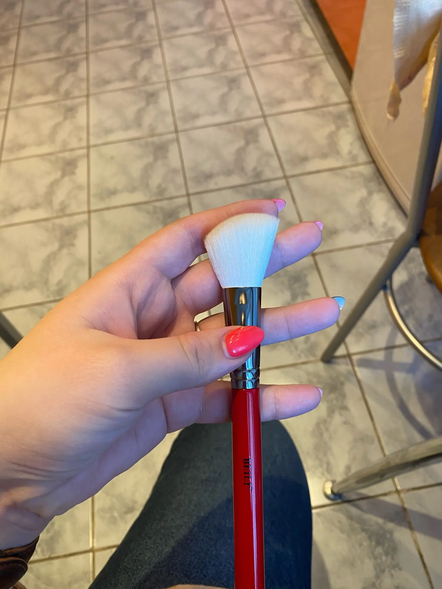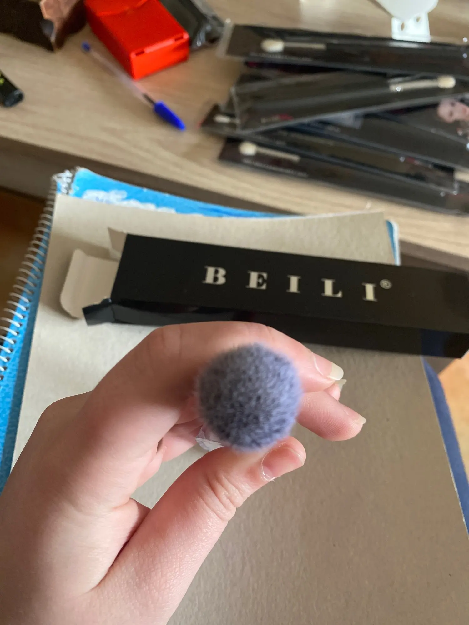 Кисть для румян. Нормальное качество. Ворс очень мягкий. Длина ворса 3 см (с длинной стороны). Длина ручки 14 см.