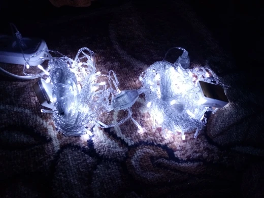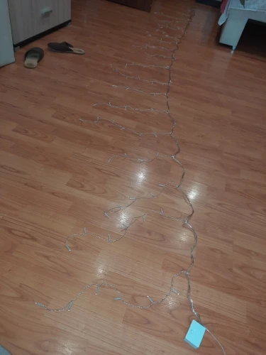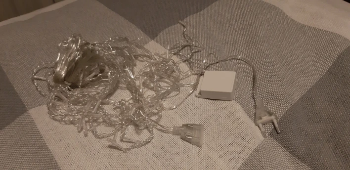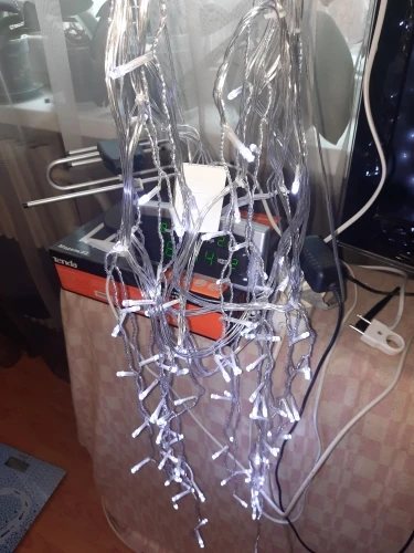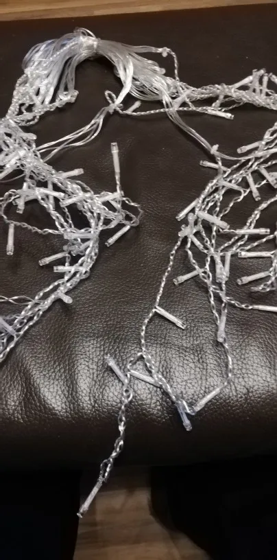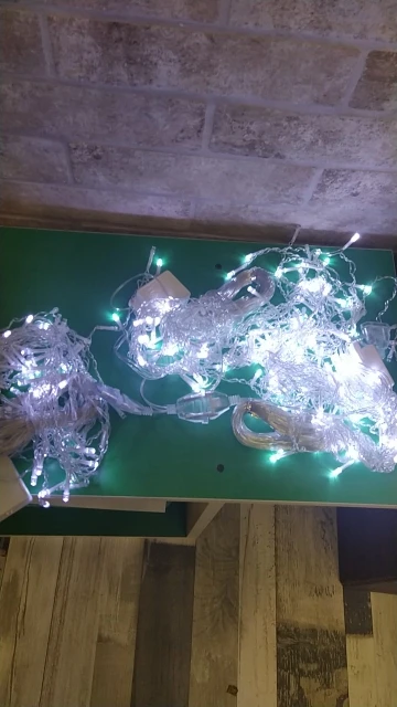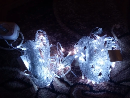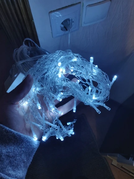 Посылку получил быстро, даже раньше обещанной даты. Гирлянда соответствует описанию. "Рабочая" длинна 4 метра и сетевой шнур пол метра. Через всю гирлянду проходят "напрямую" два провода соединённые с сетевой вилкой для подключения другой гирлянды. Провода очень тонкие и нежные нужно быть осторожным что бы не порвать.