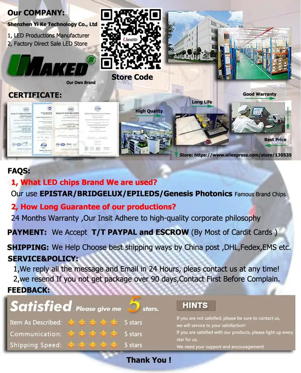 •Шэньчжэнь Yi Ke Trade Co.,Ltd"UMAKED"Наш собственный бренд, мы можем помочь сделать(OEM/ODM)Для Светодиодный светильник Запчасти• Мы принимаем много видов оплаты, 5 партий или более Скидка 10% на авто, другие большие заказы свяжитесь с нами, наслаждайтесь покупками!