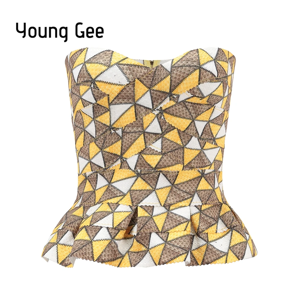 Женский укороченный топ с оборками YoungGee, короткий бандажный Топ без бретелек с геометрическим принтом, тонкая кофточка, на лето