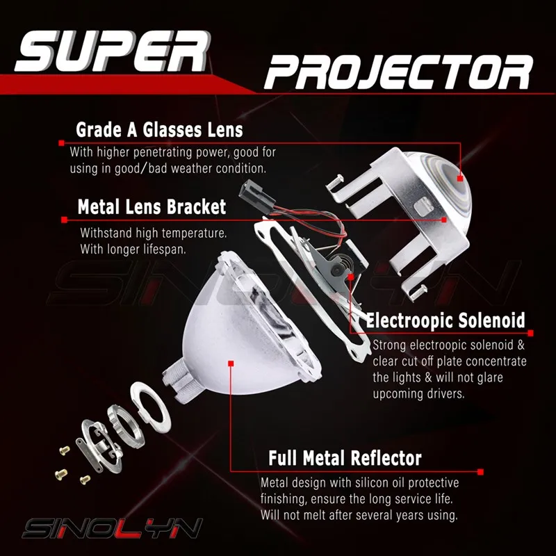 Соленоид:В этих линзах используется Сильный магнитный соленоид, который будет тянуть Дальний свет затвора на все пути, чтобы обеспечить больший выход на светильник, когда на высоких балках. С более сильным соленоида мы разработали более глубокий высокий луч, который будет освещать дальше по дороге.