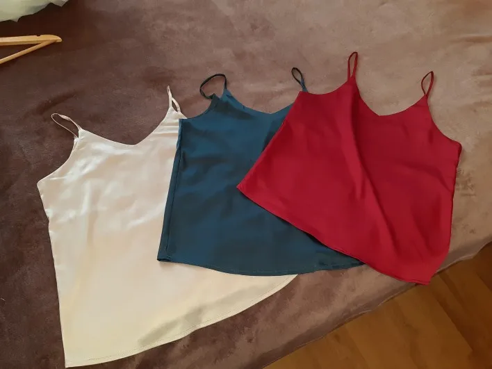 Заказывала также зелёный и голубой топ. У этого же фактура ткани отличается и не в лучшую сторону. Он не шелковистый, а из более грубой ткани.