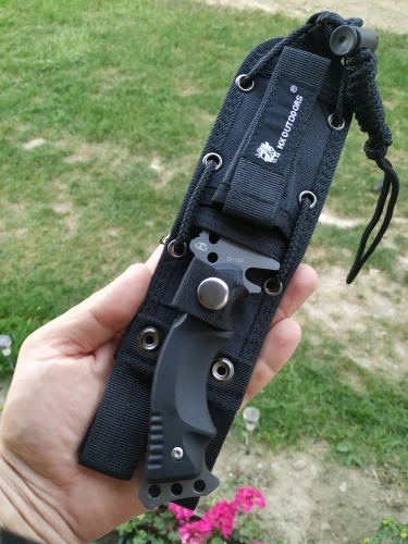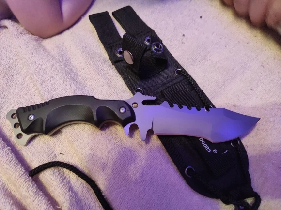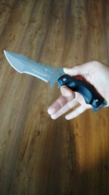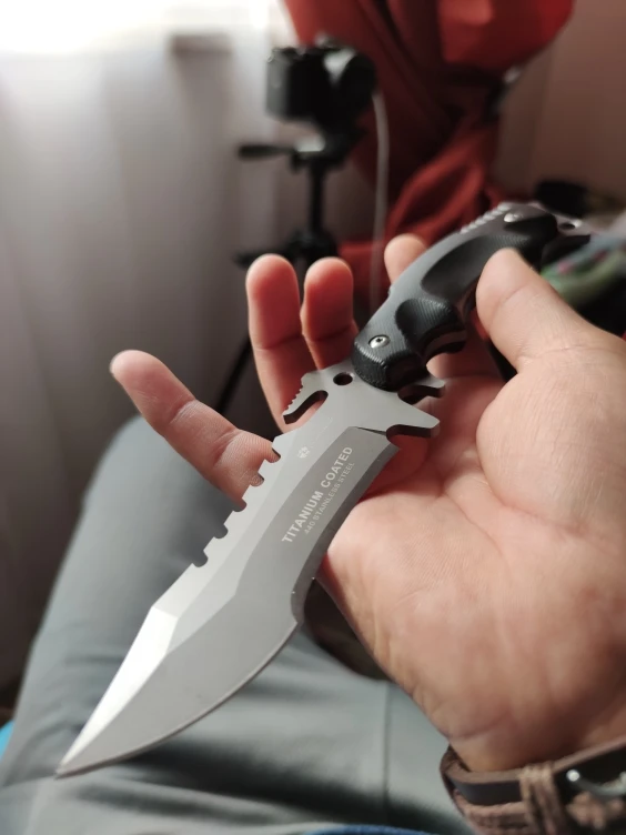 Доставка из России, вместе с обработкой пришёл за неделю. Отличный острый нож. Очень острый. Очень отличный. Качество на высоте. Хват у рукояти удобный, но довольно непривычный: под углом и с большим пальцем наверху. Бумагу режет, ветки тоже легко. В дерево входит без проблем. Метнуть на расстоянии 2-3 метров можно спокойно. Затачивается без проблем. Если приделать к палке, получится устрашающее копье. В комплекте были еше неплохие ножны и паракорд. Пальцем остроту вдоль НЕ ПРОВЕРЯТЬ (посмотрите на указательный палец).