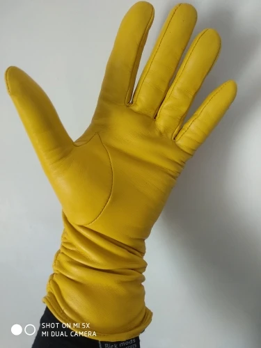 Как же долго я искала удлинённые жёлтые перчатки. Покупала под шубу, там рукав расширяется к манжете, поэтому было важно, чтоб перчатки закрывали запястье. Ношу размер 7, мои замеры также совпали с размерной сеткой производителя. Доставка около трёх недель Новой почтой (в Украину). Когда примерила дома, то длина для пальцев была нормальная, а вот для кисти ширина показалась великоватой. Но, когда надела их на улицу (-8 °С), то засчет свободного прилегания, руки в перчатках не мерзли. И кстати, именно в этом цвете подкладка шерстяная. В комментарии к заказу попросила продавца проверить швы. Должна отметить, что все целое, швы ровные, нитки не торчат. Неприятного запаха от перчаток не было. Очень ими довольна.