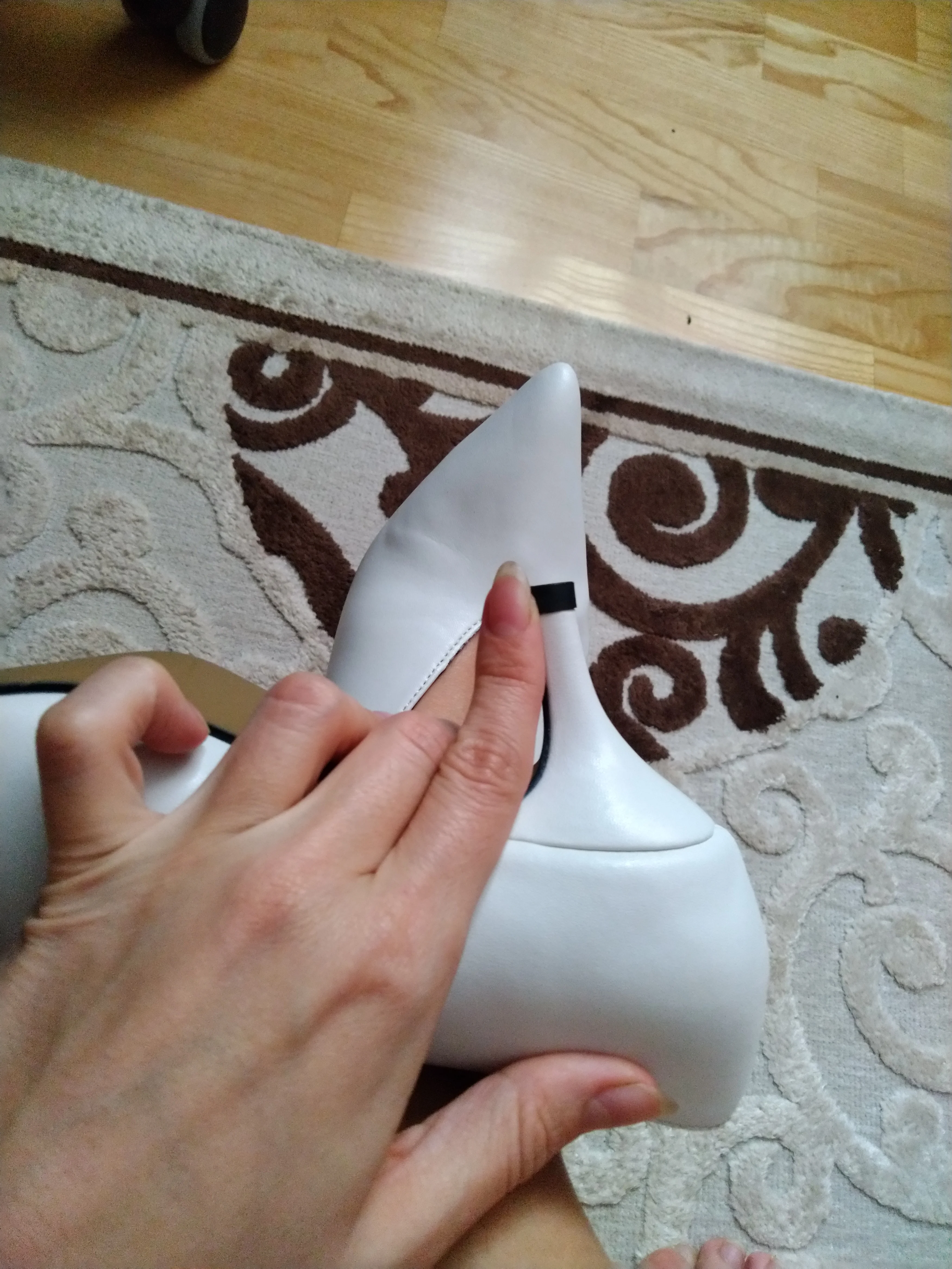 Мягкие, удобные и элегантные туфли. Без запаха. Сквозь материал проступает рельеф пальцев, но это не заметно в черном цвете. Подозреваю, что в другом цвете будет довольно заметно. Размер выбранный по сетке продавца подошёл идеально. Долго искала такие туфли и очень довольна покупкой. Рекомендую.