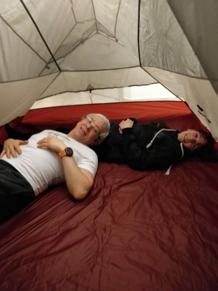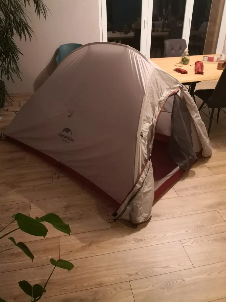 Очень легкий, маленькая упаковка. К сожалению, я могу только немного подогнать по диагонали (я на 195 см, стоя), мои пальцы толкают заднюю сторону палатки, лежа на спине (может быть, действительно растягивая его, я могу заработать на один или два сантиметра больше), только протестировали его как автономный шатер в комнате. Кувшин очень легко и быстро.
