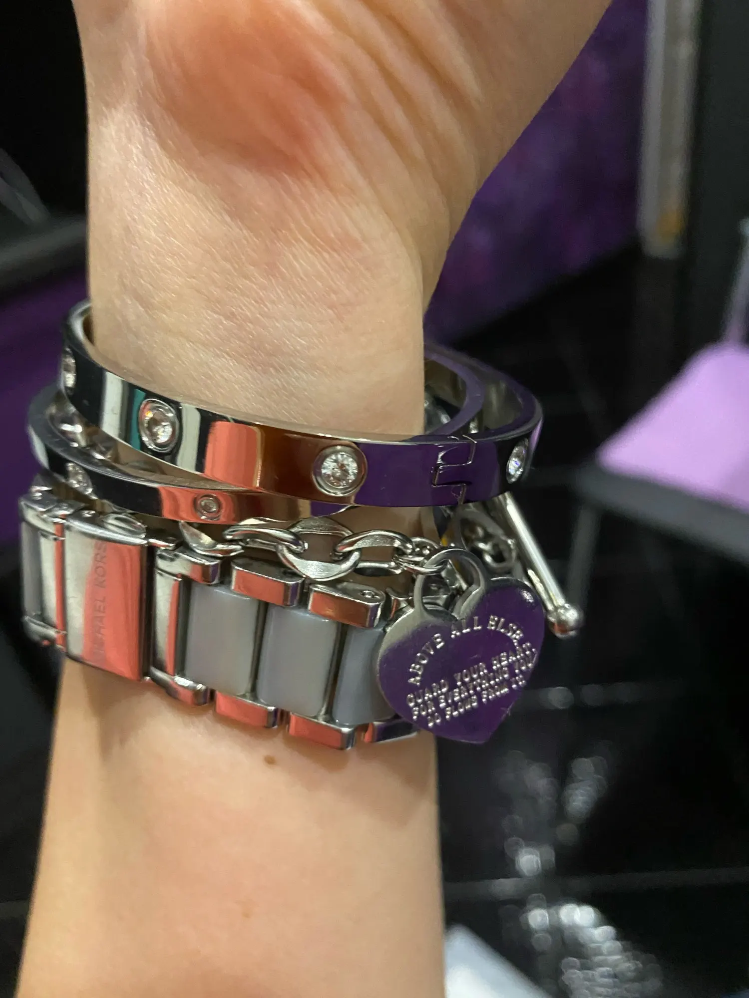this is absolutely beautiful I bought this bracelet to go with a coach bracelet that I own and also. With a Pandora bracelet and I'm going to show a picture of it it's absolutely gorgeous but you have a big wrist I would not recommend but it's perfect for smaller wrists