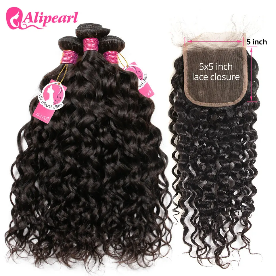 Алиперл волосы волна воды пряди с закрытием бразильские волосы плетение 3 пряди с 5x5 закрытие свободная часть Remy Волосы для наращивания