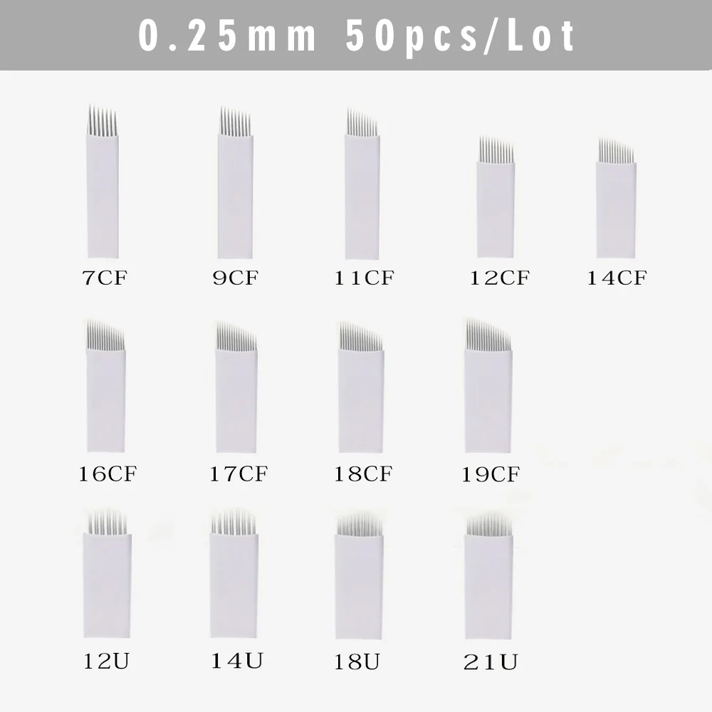 Цвет: белый Используется для: ручного микроблейдинга бровей Стиль: 7CF/9CF/12CF/14CF/16CF/18CF/12U/14U/18U/21U Особенности: 1. Он изготовлен из высококачественной нержавеющей стали, достаточно прочный для ежедневного использования 2. Иглы острые и эластичные, делают линию бровей красивой. 3. Материал: иголки сделаны из нержавеющей стали типа 316 с добавлением сплава молибдена предотвращает специфические формы коррозии 4. Для оптимальной безопасности и качества, вы можете доверять этим иглы татуировки, которые были стерилизованы гамма-лучами 5. Индивидуально упакованные, только для одного использования, идеально подходят для всех видов татуировок 6. Использование: бровей или губ татуировки Макияж/красота Список Пакетов 50 шт./лот Biomaser иглы