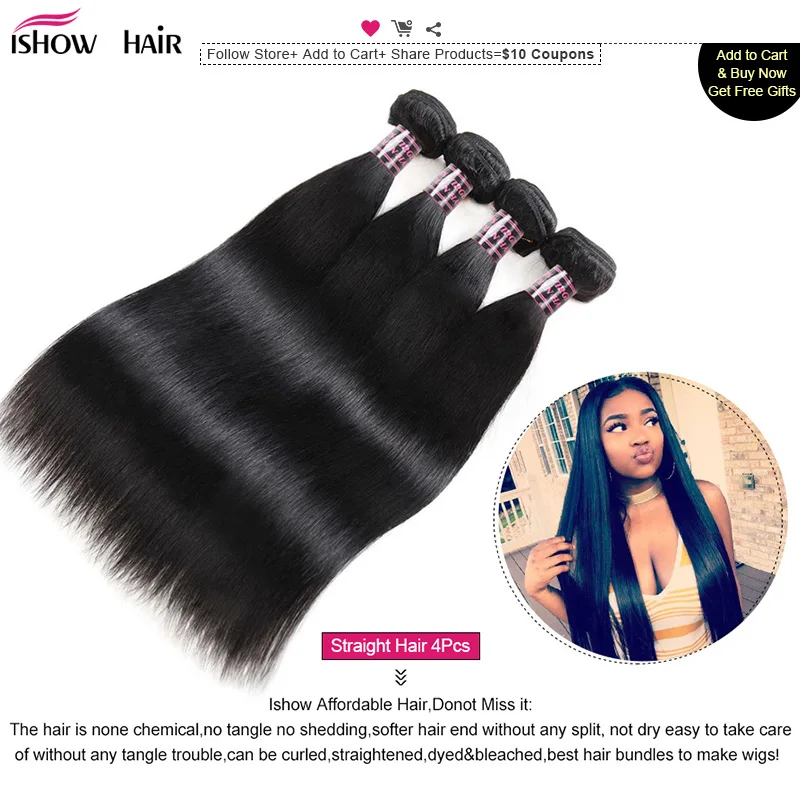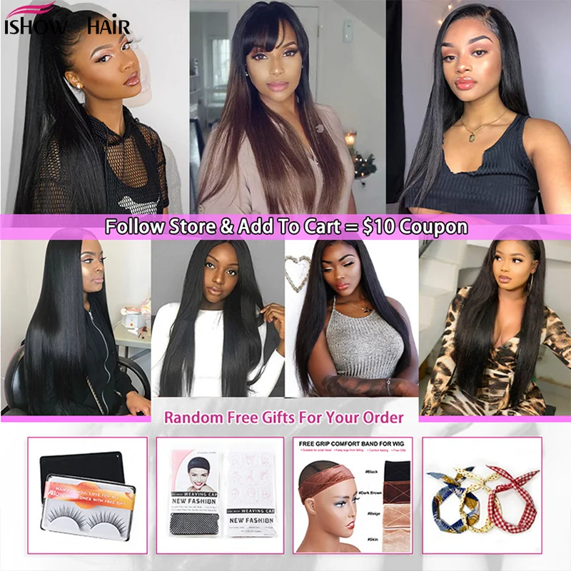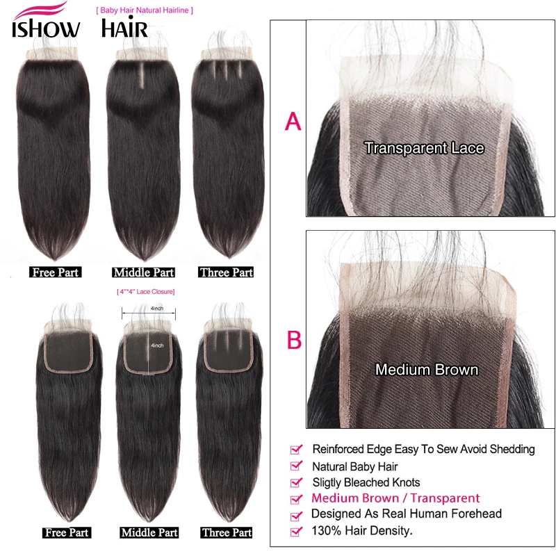 Прямые пряди волос Ishow с закрытием, прозрачное кружевное закрытие, пряди, бразильские натуральные кудрявые пучки волос пряди с закрытием