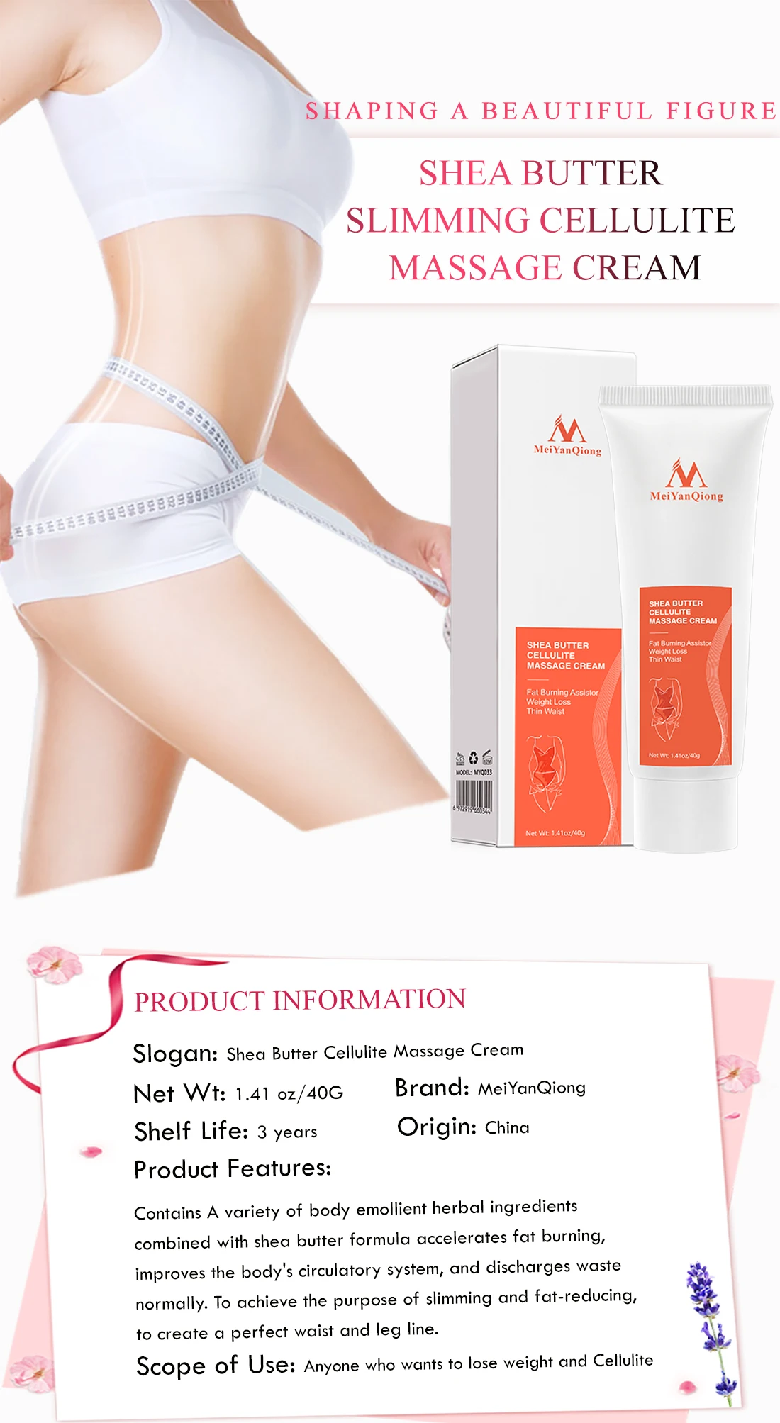 Содержит множество смягчающих растительных экстрактов, добавляют формулу масла ши, которые работают вместе, чтобы ускорить сжигание жира, улучшить кровеносную систему организма, выделяют углекислый газ и воду, И пусть Лимфатическая циркуляция регулярно выделяет отходы, тем самым устраняя первопричину ожирения. Наконец, цель похудения и целлюлита достигается, и формируется идеальная линия талии и ног.