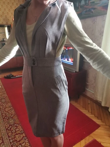Сарафан сел хорошо. Мои параметры: 164 см, 90*62*91. Плечи на месте, талия слегка великовата, но не критично, длина по колено. Заказывала М, серый. Ткань плотная, тёплая, на осень-зиму отлично. Подклад. Качественно пошит. Для работы отличный вариант!