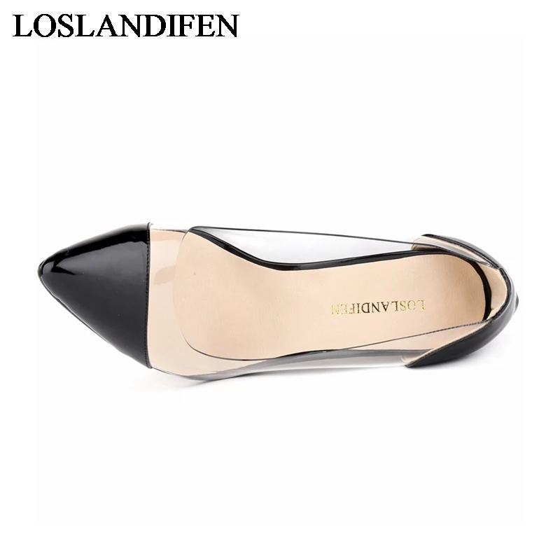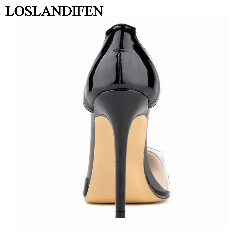 Женские туфли-лодочки на высоком каблуке с красной подошвой; Пикантные женские вечерние туфли из лакированной кожи с острым носком и прозрачной строчкой