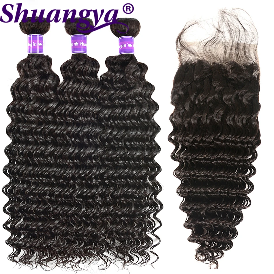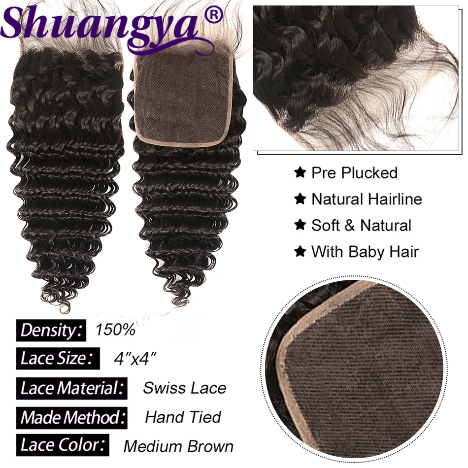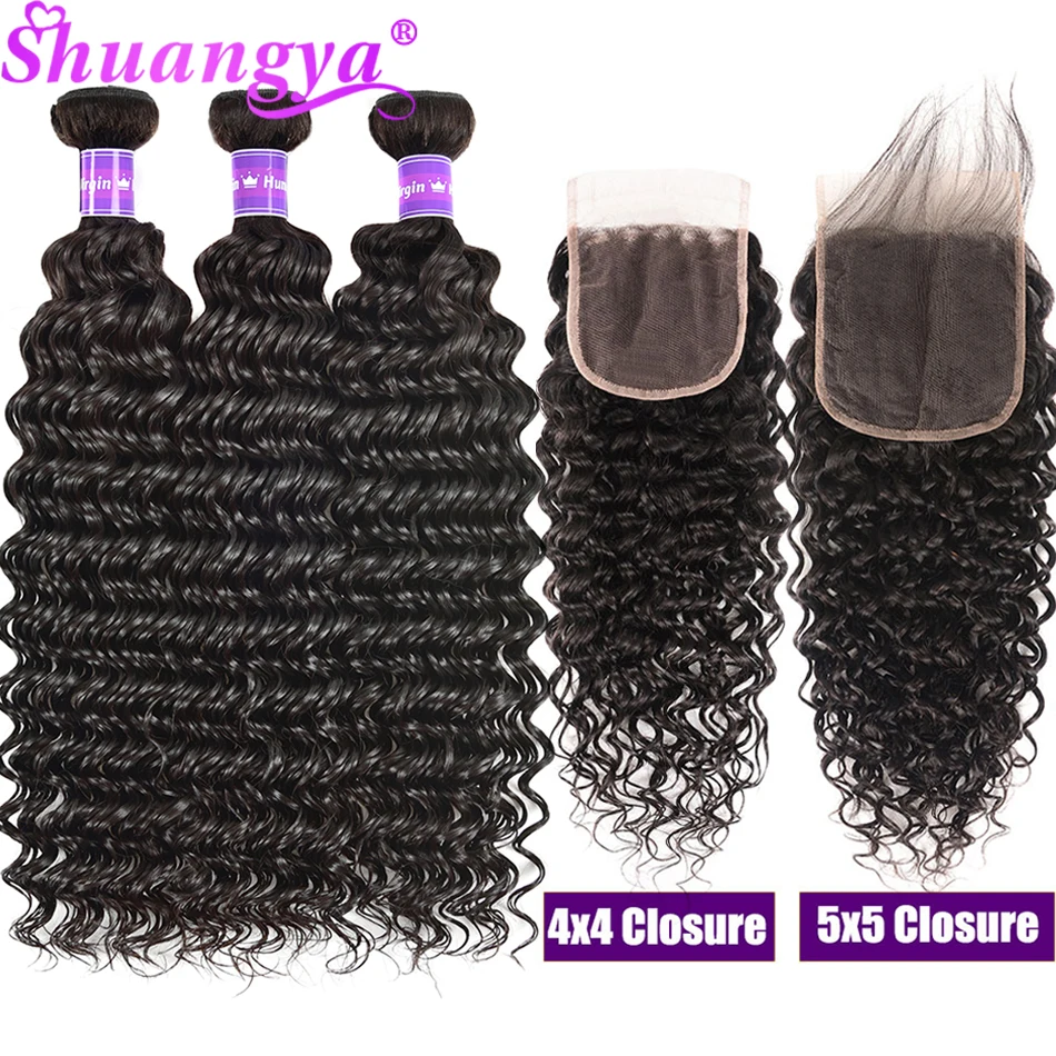 Перуанские волнистые пряди с закрытием, глубокие кудрявые волосы 4X4 5X5 HD, кружевная застежка с пряди, вьющиеся волосы Remy, человеческие волосы, натуральный черный цвет