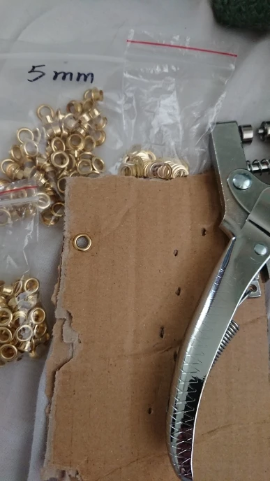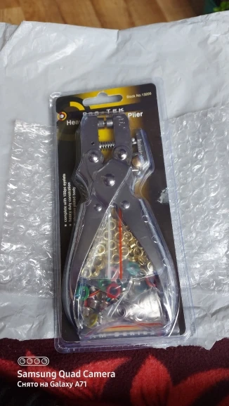 Доставка занимает гораздо больше времени, чем ожидалось. Плоскогубцы в порядке, но я не могу сделать отверстия с ним в ткани, только в картоне. Поэтому я должен сделать отверстия в ткани с карандашом или чем-то другим, чтобы иметь возможность положить люверсы. Я ожидал лучшего качества по этой цене.