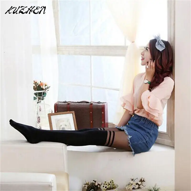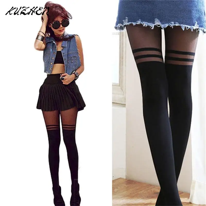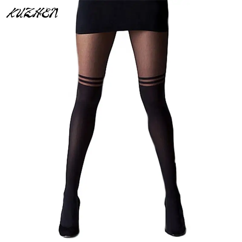 Женские Соблазнительные Черные колготки с двойной полосой, соблазнительные прозрачные чулки с ложными подтяжками, колготки, чулки, чулки, Чулки выше колена, прозрачные Облегающие изделия