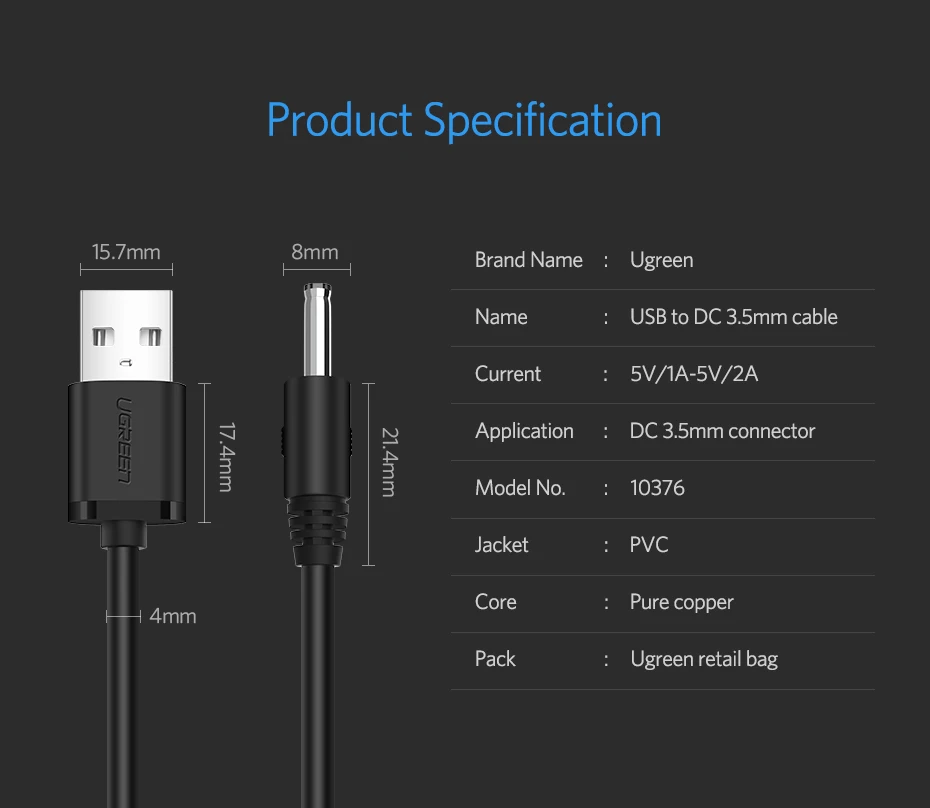 Кабель питания USB A (штекер)DC 3,5 мм Ugreen, 5 В, для сетевых адаптеров, для USB-концентраторов, вентиляторов