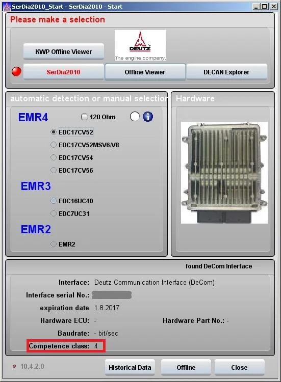 SerDia 2010-диагностический и программный инструмент, используемый для контроллеров Deutz. Поддерживаемые контроллеры: EMR2; EMR3 (EDC16UC40, EDC7UC31); EMR4 (EDC17CV52, EDC17CV52MSV6/V8, EDC17CV54, EDC17CV56). Поддерживаемые языки: английский, немецкий, французский, испанский, итальянский.
