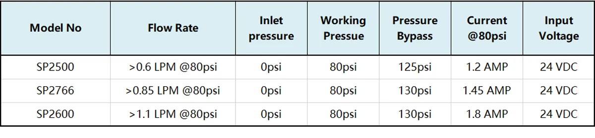 -Расход> 0,85 л/мин @ 80 фунт/кв. Дюйм-Входное давление: 0 Psi-Самовсасывание: 2 метра-Рабочее давление: 80 фунтов на кв. дюйм-Байпас давления: 130 фунтов на кв. дюйм-Напряжение 24 В постоянного тока-Циферблат 1,45 А при 80 фунтах на кв. дюйм-Порт 3/8 "NPTF (фитинги 3/8"-1/4 ")-Температура воды: 5-45 °C-Размер 19 см x 11 см x 9 см-Хороший выбор для фильтра воды и решения для подачи воды-Фитинги в комплекте