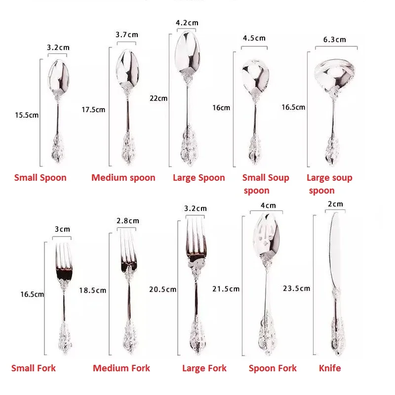 Маленькая ложка: 15,5 см маленькая вилка: 16,5 смЛожка, вилка: 21,5 см, большая ложка для супа: 16,5 см