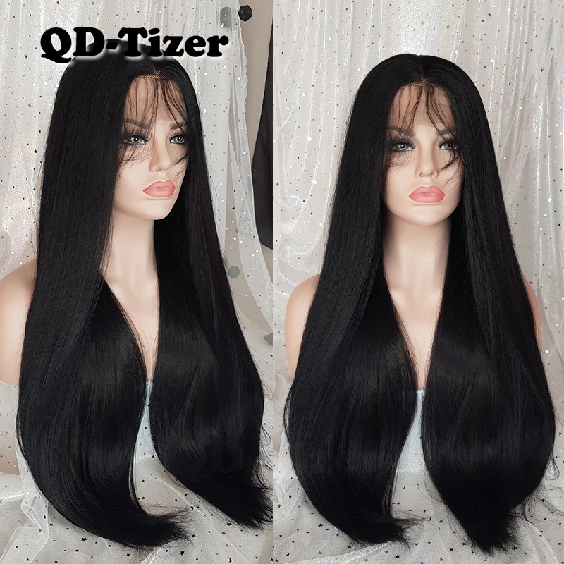 QD-Tizer длинные Yaki волосы черного цвета прямые синтетические кружевные передние парики с детскими волосами волосы светлые Yaki парики для женщин