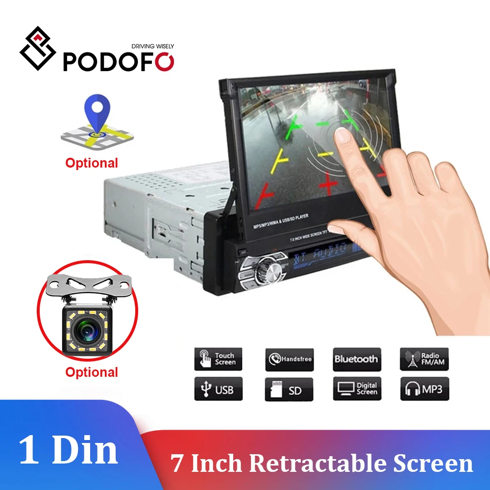 Автомагнитола Podofo 1DIN, автомобильный радиоприемник Retractab, автомобильный стерео Bluetooth, 7-дюймовый HD Автомобильный плеер, автомобильный стерео FM MP5 с камерой заднего вида
