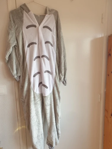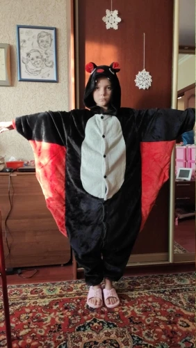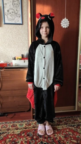 Мягкая и нежаркая ткань (100 полиэстер), костюм на пуговицах, хорошая вышивка на капюшоне. Удлиненное " туловище" так что попа костюма будет висеть между ног. Цвет очень яркий, пижама очень уютная - рекомендую. Кстати подходит по размеру и взрослым ( на русс 48й)