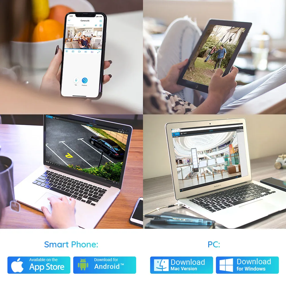Независимо от того, где вы находитесь, вы можете получить удаленный доступ к камере, чтобы увидеть прямую трансляцию и оставаться на связи.Удаленный просмотр камеры через: бесплатное приложение Reolink на мобильном устройстве, бесплатный клиент Reolink на вашем компьютере.