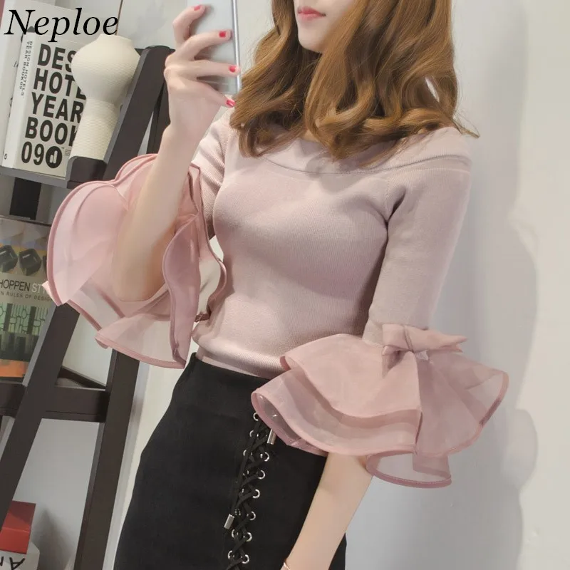 Neploe корейские модные сексуальные женские свитера с воротником-лодочкой 2022 Новые пуловеры в стиле пэчворк с расклешенными рукавами с бантом уличная одежда трикотажная одежда 66934